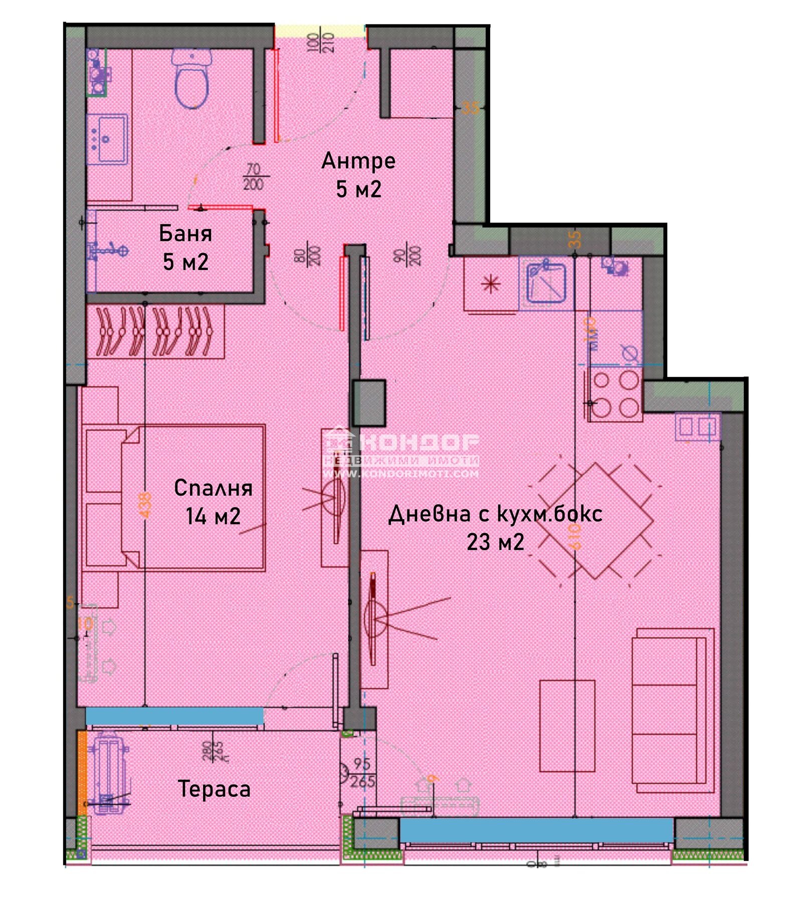 Жилището е двустайно, състои се от дневна 23 кв.м. с трапезария и кухненски бокс, голяма самостоятелна спалня 14кв.м., баня с тоалетна, входно антре с перално и една тераса с достъп от двете стаи. Апартаментите се издават на шпакловка и замазка с възможност за завършване до ключ срещу допълнително заплащане. Двете сгради имат самостоятелен подземен паркинг, между тях е обособено богато озеленено парково пространство с детски площадки, осигуряващо спокойна и просторна среда за отдих. Комплексът е разположен до големи пътни артерии даващи възможност за бърз достъп до всяка точка на града. ВИЖТЕ ОЩЕ ИЗГОДНИ ОФЕРТИ НА https://www.kondorimoti.com/ С ЕЖЕДНЕВНА АКТУАЛИЗАЦИЯ!