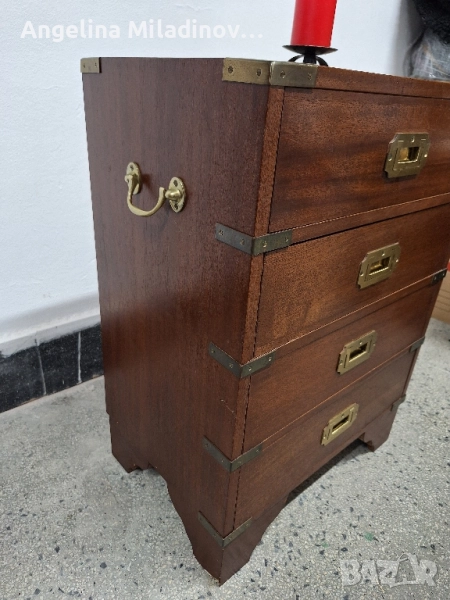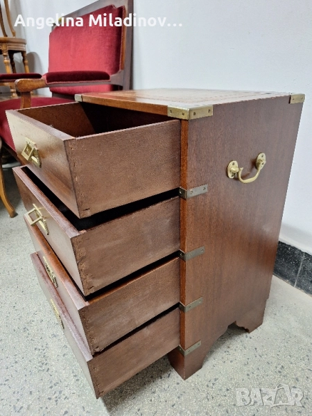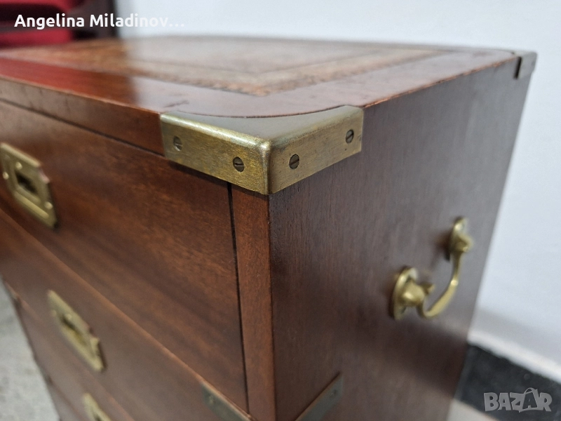 Фантастичен античен махагонов скрин в стил Военна кампания, внос от Дания. Произведен е в Англия и датира от около 30-те години на миналия век. Чекмеджета със скрити дръжки, богат месингов обков, месингови дръжки от двете страни и естествена кожа на плота подчертават красотата му. Интересна антична мебел за всеки дом, офис или кантора. Разгледайте и другите ми обяви. Предлагаме и изгоден транспорт за цялата страна. Размери: Дължина - 47 см. Ширина - 31 см. Височина - 63 см. Цена - 280 лв. 143,16 €.