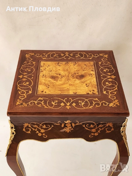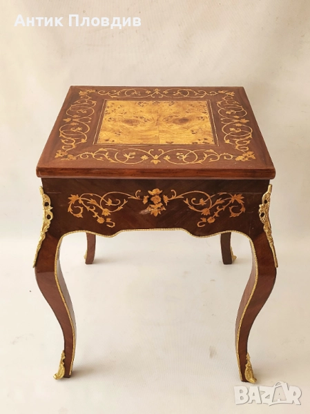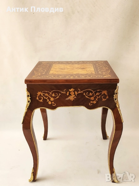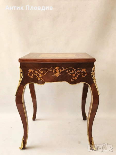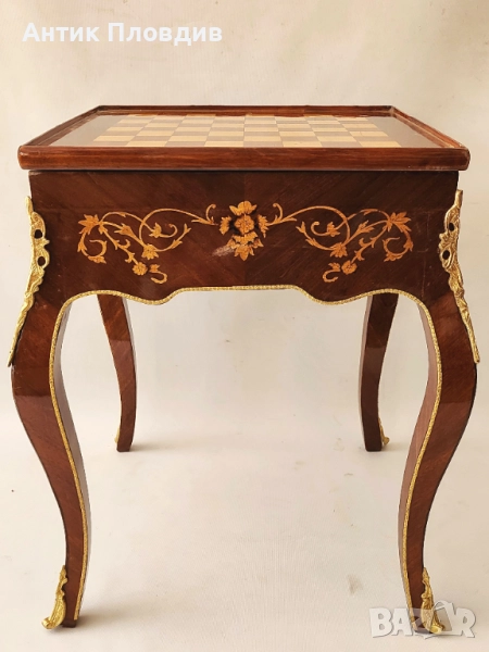 Елегантна игрална масичка с богата украса и функционален дизайн. Горният плот е комбиниран – от едната страна е с красиви флорални инкрустации, от вътрешната страна се открива табла, а от другата страна шахматно поле. Краката са леко извити и украсени с позлатени бронзови апликации, които подчертават изисканата визия. Тази масичка съчетава декоративна стойност и практичност, превръщайки се в стилен акцент за всекидневна или кабинет.