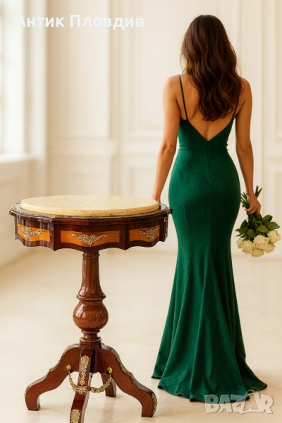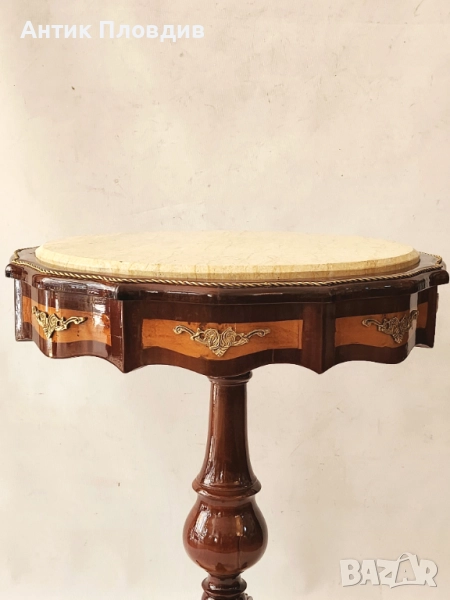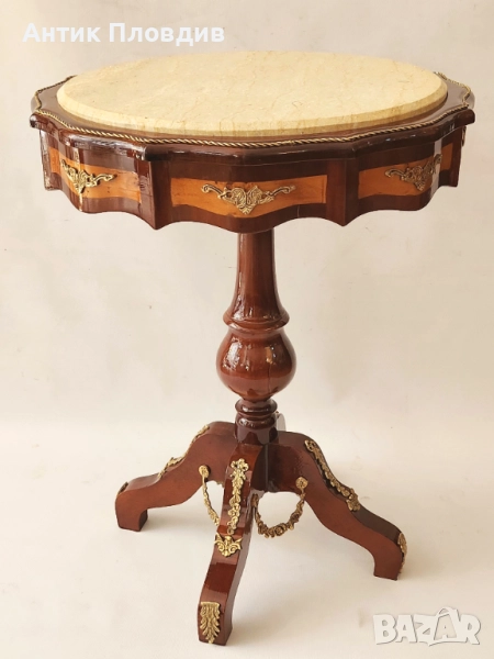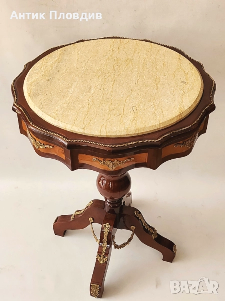 Елегантна помощна маса с кръгъл мраморен плот в светъл тон, който придава усещане за лукс и изисканост. Дървената основа е с богати извивки и декоративни апликации от месинг, подчертаващи класическия характер на масата. Трикраката стойка с централна обла форма придава стабилност и хармония. Подходяща за акцент във всекидневна, антре или като поставка за декоративни предмети.