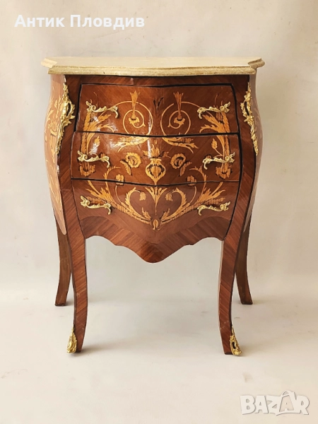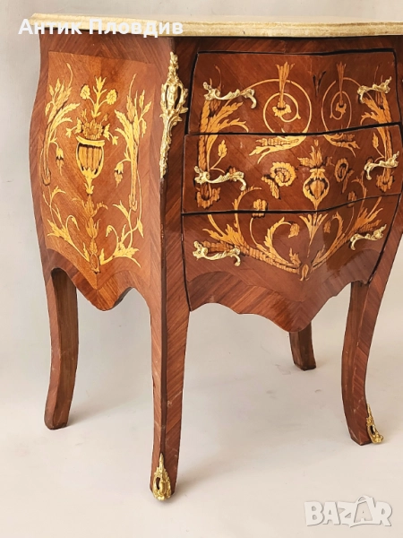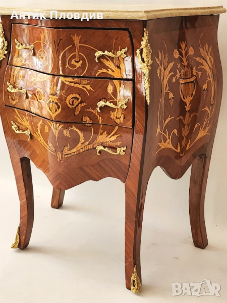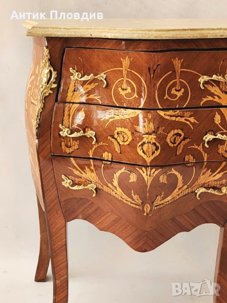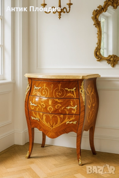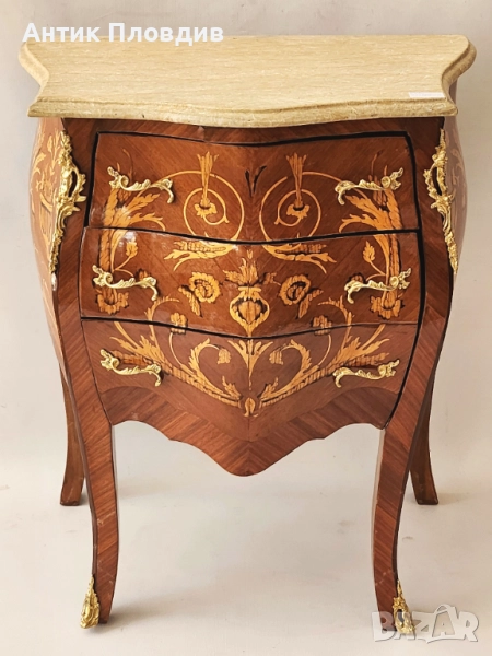 Луксозен скрин в бароков стил с изразителни извивки и богата декорация. Фасадата е украсена с флорални инкрустации от различни видове дърво, а ъглите и краката са акцентирани с позлатени бронзови апликации. Горната част е завършена с елегантен мраморен плот в светъл тон, който придава изтънченост и завършеност. Скринът разполага с две чекмеджета, съчетаващи функционалност и естетика.
