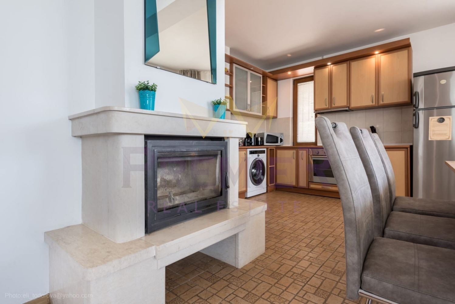 Първи етаж: просторна дневна с кухненска и трапезарна част с камина и директен излаз към двора и басейна , спалня , баня с таалет и тоалет