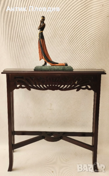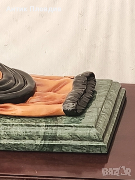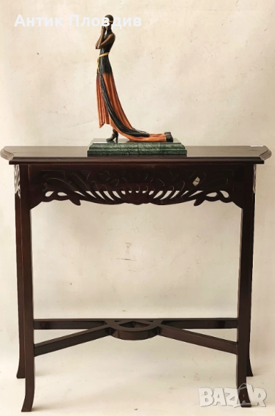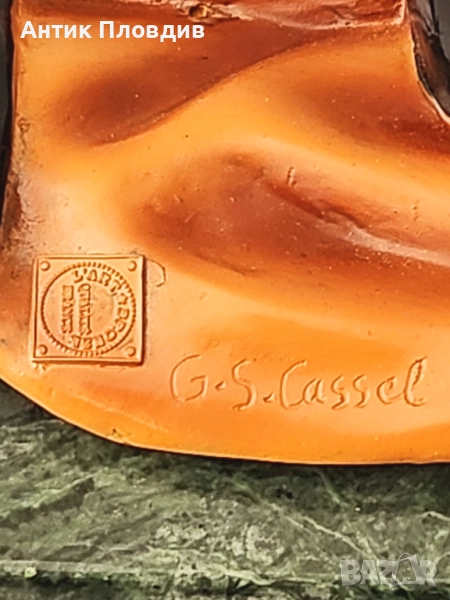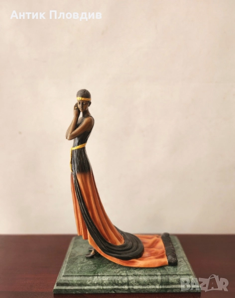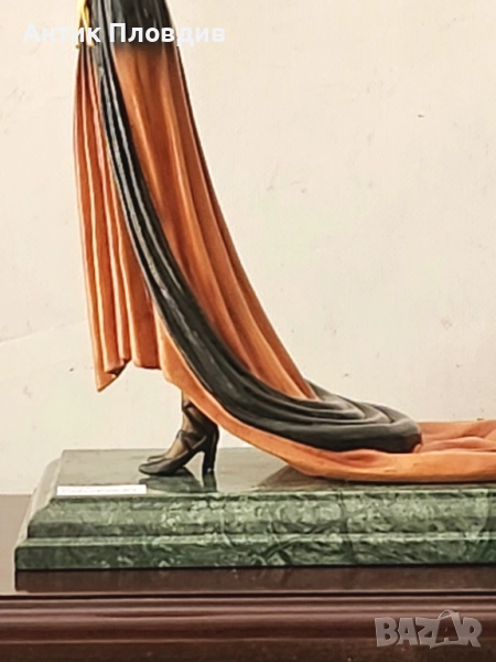 Елегантна статуетка на дама, дело на скулптора G. S. Cassel. Изработена е с изключително внимание към детайла – изящната фигура е облечена в дълга рокля в оранжево и черно, подчертана с жълт колан и лента за глава. Композицията излъчва изтънченост и духа на началото на 20 век. Статуетката е поставена върху мраморна основа и маркирана с печат Bronze Qualité France и подпис на автора.