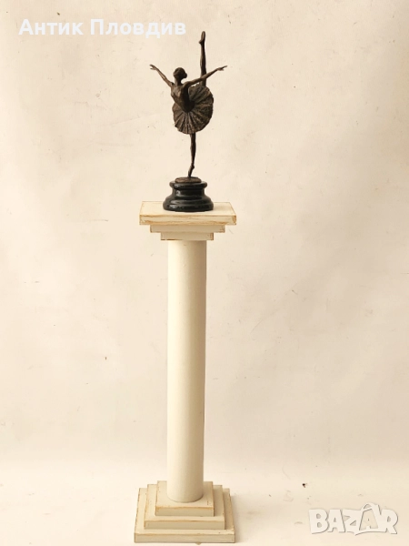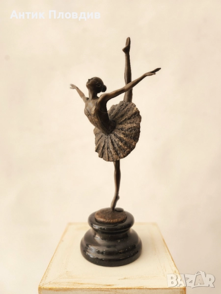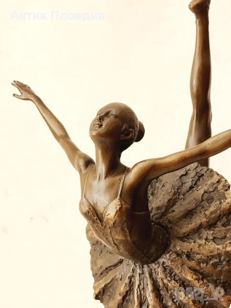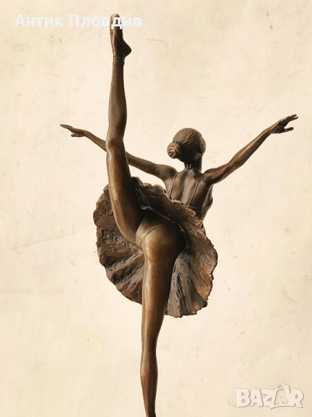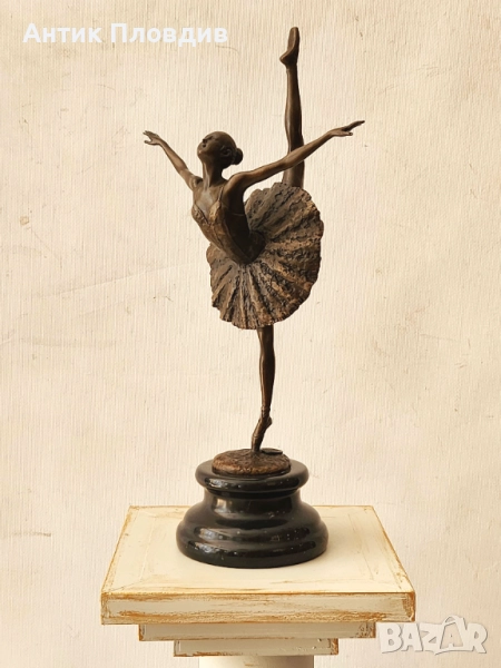 Изключително елегантна бронзова статуетка, изобразяваща балерина в изправена поза с високо вдигнат крак. Скулптурата впечатлява с изящество и внимание към детайла – от фините черти на лицето до богатата текстура на балетната пола. Поставена е върху масивна мраморна основа, която подчертава баланса и красотата на композицията. Маркирана с печат Bronze Qualité Paris и подпис на автора Milo.