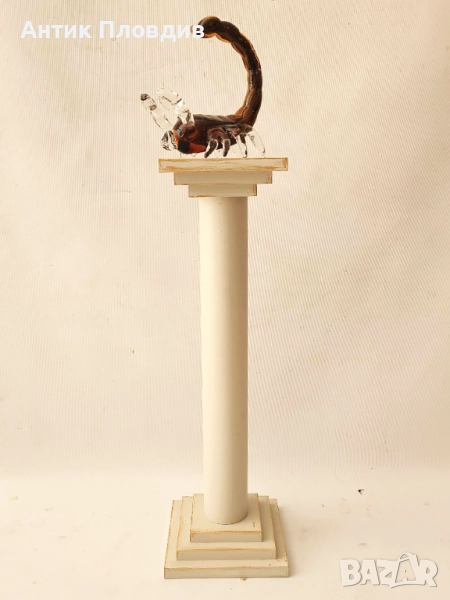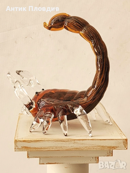 Декоративна фигура на скорпион, изработена от ръчно издухано стъкло в стил Мурано. Тялото е оформено в кафяви и златисти нюанси, а краката и щипките са прозрачни, което придава лекота и изящество на композицията. Извита опашка с детайлно изработен връх подчертава динамичния характер на фигурата. Подходяща за колекционерска витрина или като силен акцент в интериора.