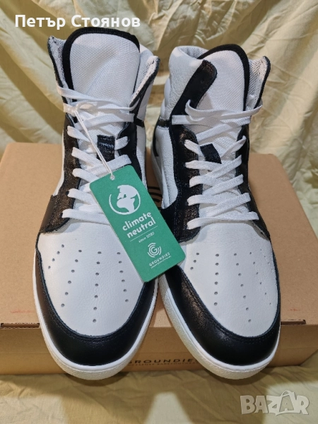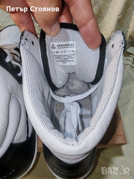 Предлагам нови мъжки кецове на марката Groundies€ обувките са чисто нови, с етикет и в кутия. Купувани са преди година на разпродажба за 59.95 евро. Изработени са от естествена кожа /бяло и черно/, хастарът и стелката са от текстил, а подметката от бял полиуретан. Дължината на стелката е 29.5 см, височината на подметката е 2 см, височината на цялата обувка е 15.5 см. Изпращам с избран от купувача куриер и възможност за преглед и тест.