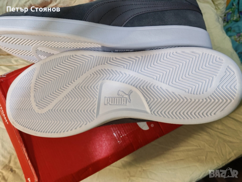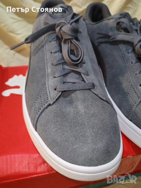 Предлагтам стахотни мъжки спортни обувки на марката PUMA, моделът е Smash V2 . Обувките са оригинални, чисто нови, в кутия. Купувани са на разпродажба за 59 евро при редовна цена от 119 евро. Изработени са в Камбоджа от естествен велур, цветът е много хубаво мише сиво. хастарът и стелката са от текстил, а подметката от бял полиуретан- Дължината на стелката е 30.5 см, височината на подметката е 3 см. Изпращам с избран от купувача куриер и възможност за преглед и тест.