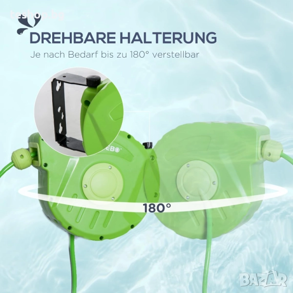 ГЪВКАВО СЪХРАНЕНИЕ: Макарата се монтира удобно на стената на къщата ви със стенна скоба и може да се завърта на 180°.