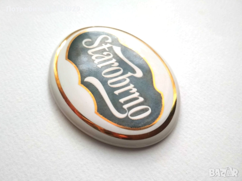 Лого на бира Starobrno- от бар машина за наливна бира. Предполагам се е залепвала или закрепвала към основа, указваща марката на текущата налична наливна бира.