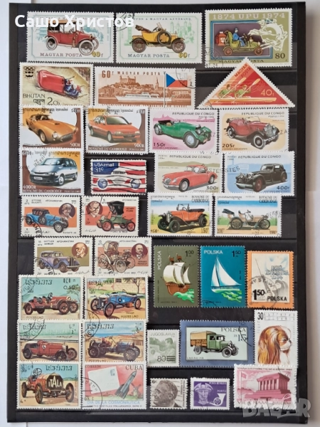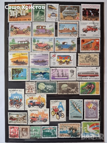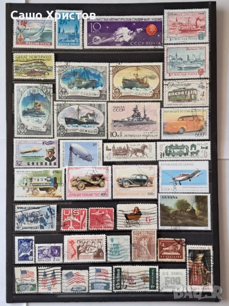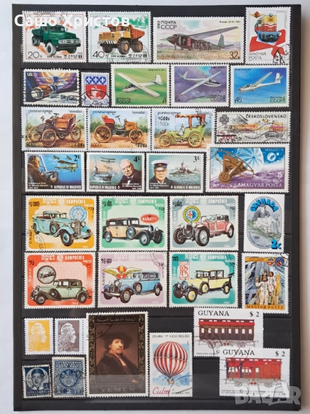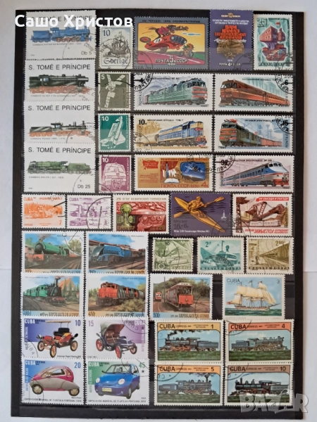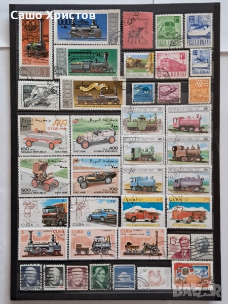 Марките, които продавам са 381, от тях около 320 са тематика ”Транспорт” (влакове, автомобили, самолети, кораби, космически апарати и други). Ще ги получите върху листи от класьори (както се виждат на снимките). Всички са различни - няма повтарящи се.