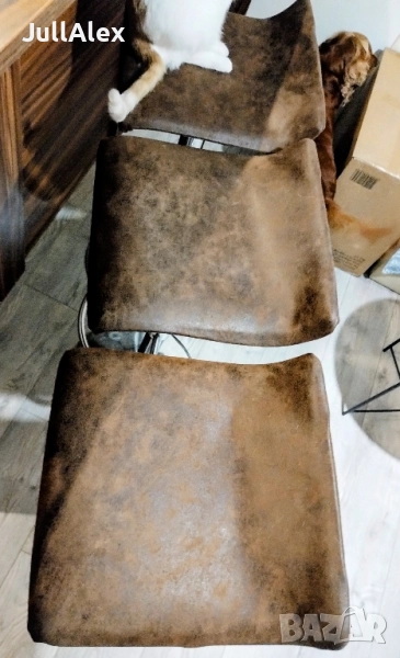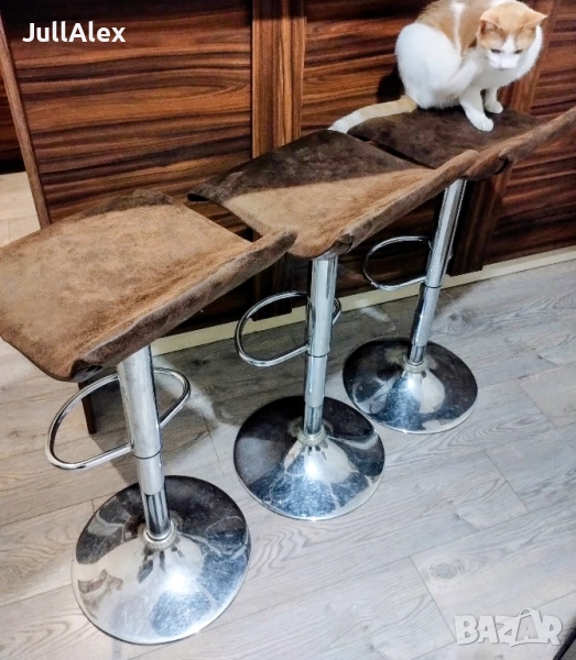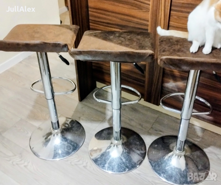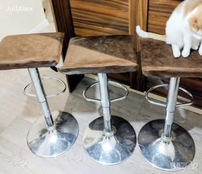 Три броя бар столове. Тапицерия тъмно кафява. Регулируема височина. Подходящи за кухня.