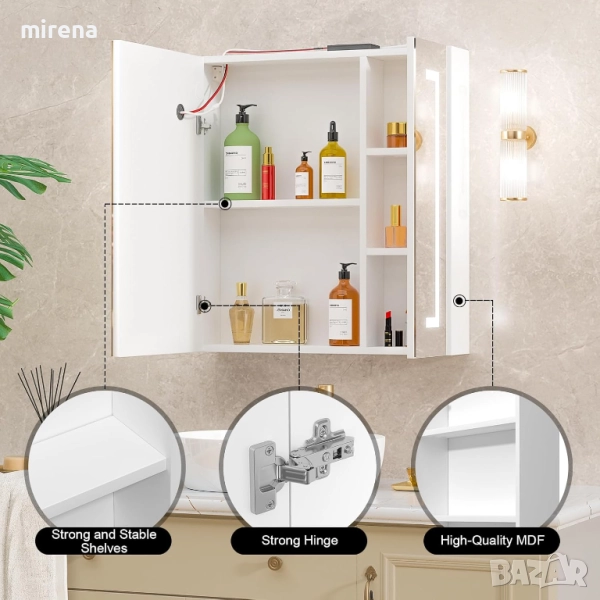 Нов ъпгрейд на огледален шкаф за баня Mepplzian с LED осветление Огледалният шкаф за баня е изработен от ПДЧ клас E1 и сребърно огледало без мед с LED светлина, висококачествен материал, устойчив на влага и вода, подходящ за баня. MDF задна плоча за максимална стабилност.