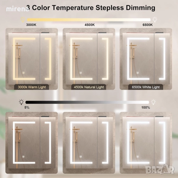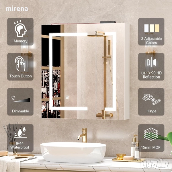 Шкафове за баня с осветлениеТози огледален шкаф за баня с LED осветление има интелигентно управление с тъч сензор. Просто щракнете върху светодиодния сензор, за да задействате превключвателя, натиснете продължително, за да контролирате силата на цветната температура (3000); натиснете кратко 3 цвята, за да регулирате модерния огледален шкаф за баня; Шкафове за баня с огледало и осветление за ежедневна употреба от вас и вашето семейство.