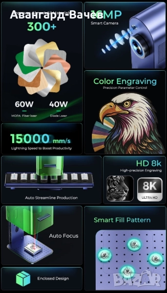 Шперплат Кожа Акрил Хартия Покритие на метал Рок Храна Каучук Визуално позициониране и гравиране с изкуствен интелект Използвайки предварително установен обектен модел, камера идентифицира моделирания детайл в работното пространство, подравнява го точно и съответно стартира работния процес. Пакетна обработка Разширената работна зона и автоматизираното конвейерно устройство повишават производствения потенциал на вашия бизнес. Пакетна обработка - Подобрява производствения потенциал на вашия бизнес С визуално позициониране и интелигентна камера, просто заредете материалите на конвейера и готовата партида ще бъде готова за минути. Автофокус Високопрецизен автофокус от индустриален клас, система за визуално определяне на разстоянието, невероятна прецизност и несравнима скорост. Едно щракване прави производството по-плавно. 3D релеф Превъзходно 3D релефно печатане, по-бърза скорост. При 100% мощност, 60W MOPA на GWEIKE G3 превъзхожда 20W фибърни лазери, осигурявайки 3 пъти по-бърза скорост и 200% по-фини детайли. 4-в-1 въртяща се приставка Изключителна гъвкавост за гравиране на цилиндрични, извити и плоски повърхности Напълно затворен предпазен щит с ултра тиха и ефективна вентилация Напълно затворен дизайн с OD5+ предпазен щит за очите за по-чисто и безопасно работно място — ефективно блокира прах, дим и изтичане на лазерна светлина. Защитният екран OD5+ ефективно блокира лазерното лъчение, докато вграден мощен вентилатор ефикасно извлича дима. Присъединете се към нашата VIP група във Facebook и вземете безплатен бутон за пакетна обработка за вашия G3. Спецификации Капацитет за обработка Лазерна мощност и лазерен източник 60W MOPA 1064nm фибър лазер + 40W 450nm диоден лазер 30W MOPA 1064nm фибър лазер + 40W 450nm диоден лазер 50W 1064nm фибър лазер + 20W 450nm диоден лазер 30W 1064nm фибър лазер + 20W 450nm диоден лазер 20W 1064nm фибър лазер + 20W 450nm диоден лазер Работна зона 6,9'' × 6,9" (175 × 175 мм) 6,9" × 19,6" (с конвейер) (175 × 1000 мм) Максимална работна скорост 15000 мм/сек Режим на обработка Лазерно гравиране и лазерно рязане Поддържани материали Лазерно рязане : Диоден лазер: Хартия, Дърво, Кожа, MDF, Филц, Някои тъмен непрозрачен акрил. Фибърен лазер: Месинг, Неръждаема стомана, Алуминий. Лазерно гравиране : Диоден лазер: Хартия, Дърво, Кожа, MDF, Неръждаема стомана, Някои тъмен непрозрачен акрил, Бамбук, Плат, Тъмно стъкло и други. Керамика, Нефрит, Мрамор, Шисти, Цимент, Тухла, Покрит метал, Боядисан метал. Фибърен лазер: Неръждаема стомана, Алуминий, Месинг, Сребро, Пластмаса, Платина, Титан, Злато и други. Максимален капацитет на лазерно рязане (липа) 20 мм при многократни проходи Максимален капацитет на лазерно рязане (акрил) 12 мм при многократни проходи Максимален капацитет на лазерно рязане (месинг) 1,5 мм при многократни проходи Максимален диаметър на ротационно гравиране 160 мм Софтуер Поддържан софтуер ГЛАЗЪР/ЛайтБърн Операционна система Windows/macOS/Android/iOS/iPad Метод на свързване USB/Wi-Fi Поддържани файлове SVG/DXF/JPG/JPEG/PNG/BMP/TIF Операция Вградена камера 16 MP интелигентна камера Режим на фокус Автофокус Метод на позициониране Позициониране на камерата Пакетна обработка Интелигентно запълване на една и съща форма Точност и прецизност Размер на лазерното петно 0,08 x 0,1 мм (диоден лазер)/0,06 x 0,06 мм (фибърен лазер) Прецизност на гравиране 0,0027 мм Прецизност на фокуса 0,5 мм Обща информация Размери на продукта 20,69'' x 8,66'' x 13'' (525,5*220*330 