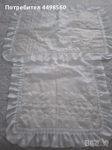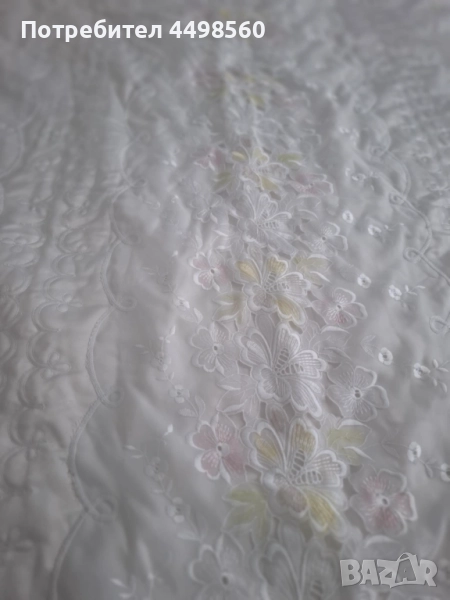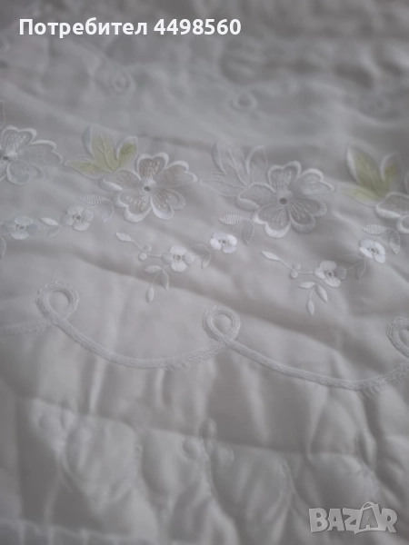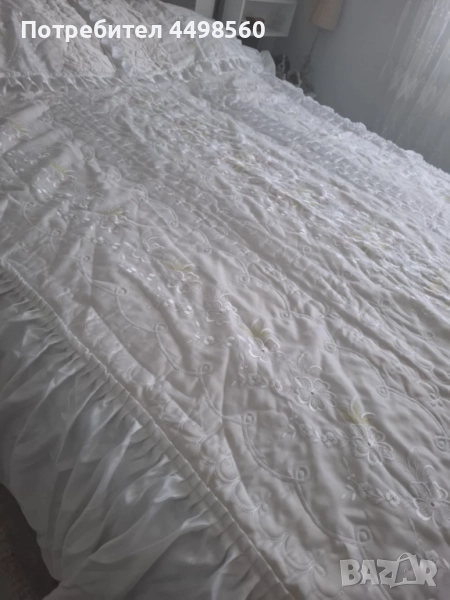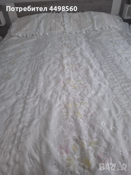 Красива бяла кувертюра/шалте за спалня с бродирани мотиви и къдрици от двете страни.Към шалтето има и две калъфки за възглавници