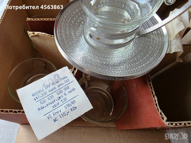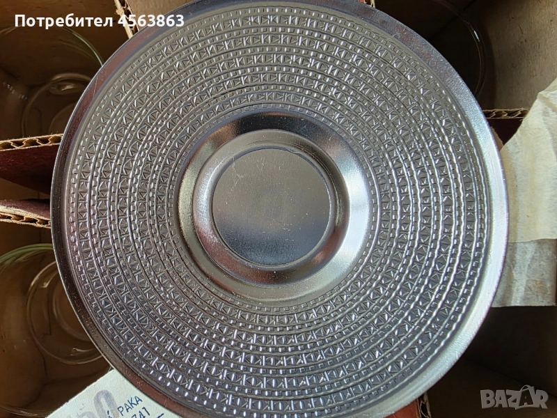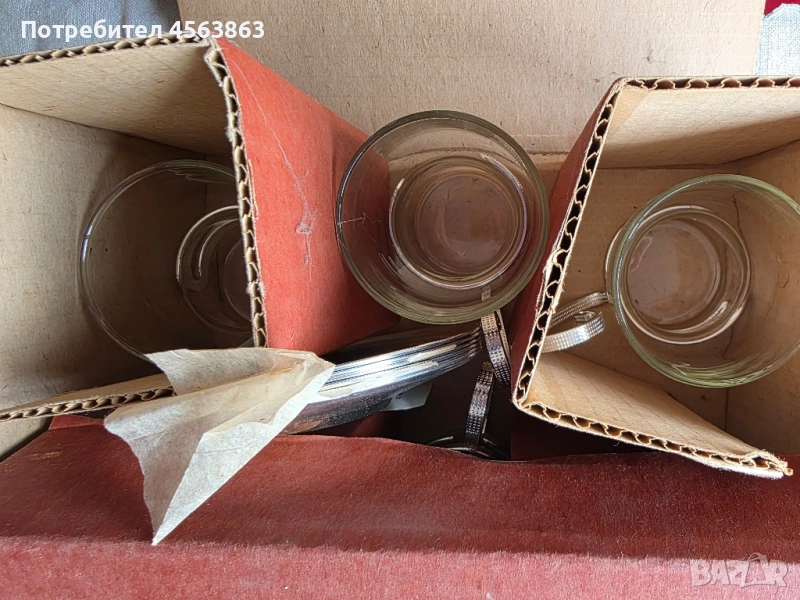 Чехословашки сервиз за кафе със стъклени чашки с много лек, вероятно алуминиев обков и чинийки от същата сплав. В оригиналната кутия, 6 чашки и 6 чинийки