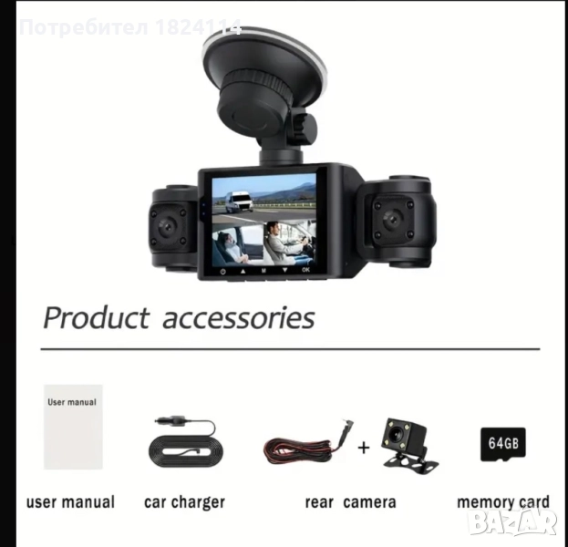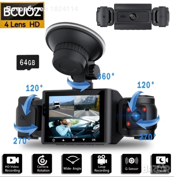 Включва безплатна 64GB SD карта, 360° въртяща се камера, камера за задно виждане, цикличен запис, нощно виждане, G-сензор и WDR