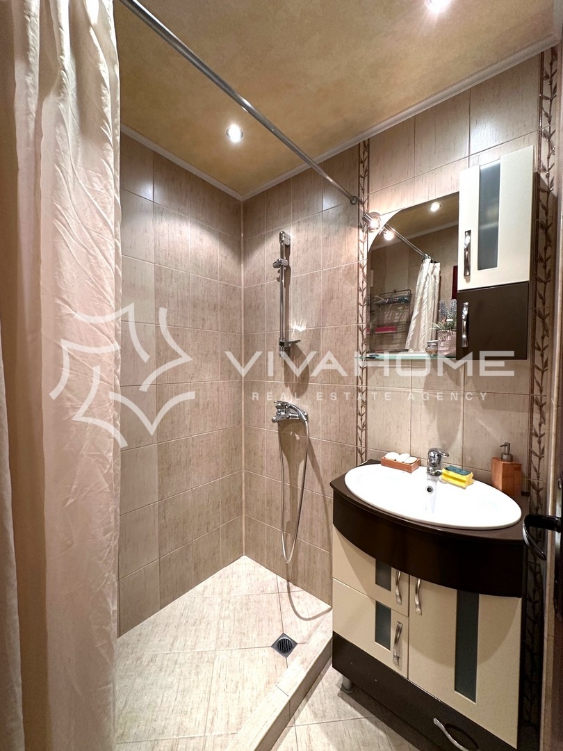 Просторната всекидневна е оборудвана с висок клас електроуреди, някои от които в гаранция, два подови климатика Daikin, щори ден и нощ, висококачествена мека мебел и трапезна маса със столове. Непосредствено до кухнята е разположен удобен килер, а едно от най-приятните места в имота е огромната тераса, която осигурява не само площ за приятни занимания, но и много слънчева светлина и красива гледка ! На второто ниво са разположени две удобни спални и баня, отново напълно обзаведени !