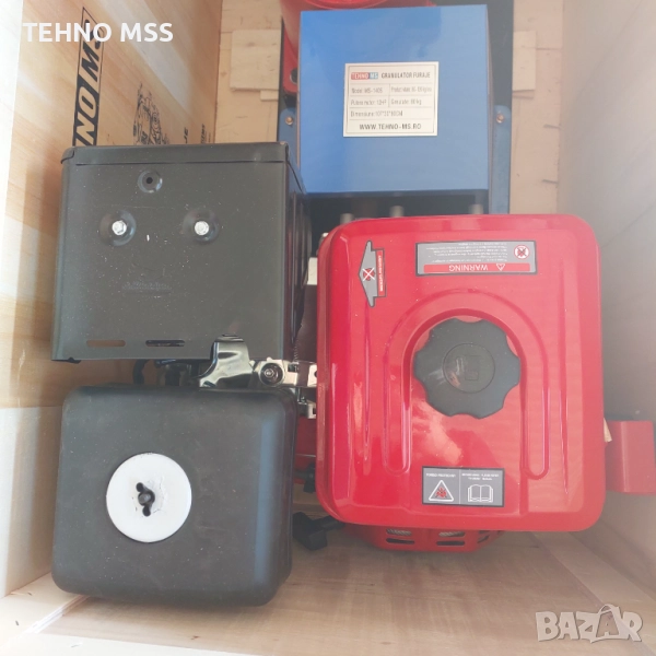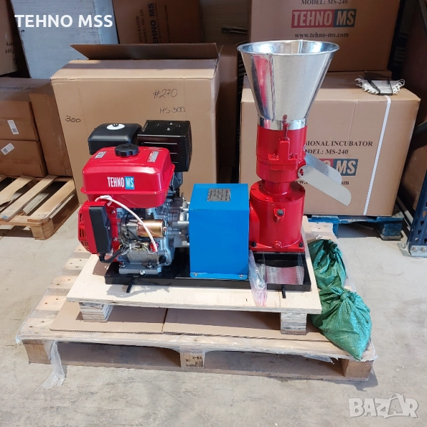 Този продукт е оборудван с: бункер за фураж, корпус на гранулатора, транспортно колело, бензинов двигател, притискащи ролки, форма, корпус на редуктора и улей за изхвърляне на гранули.