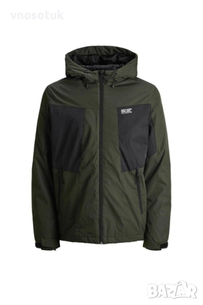 Яке с качулка JACK AND JONES с цип по цялата дължина. Принтирано брандиране. Външна част, подплата и пълнеж от 100% полиестер. Качулка с вградена подплата. Закопчаване с цип по цялата дължина. Два джоба с тик-так копчета. Вътрешен джоб с велкро закопчалки. Леко оформен подгъв.