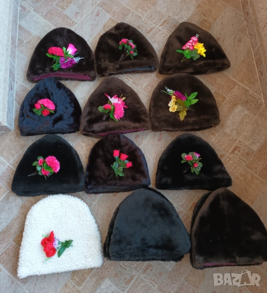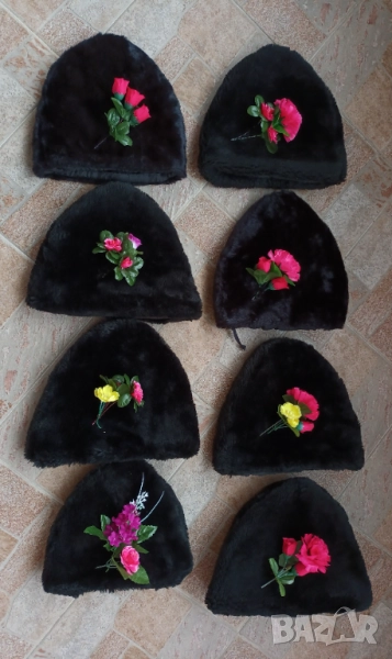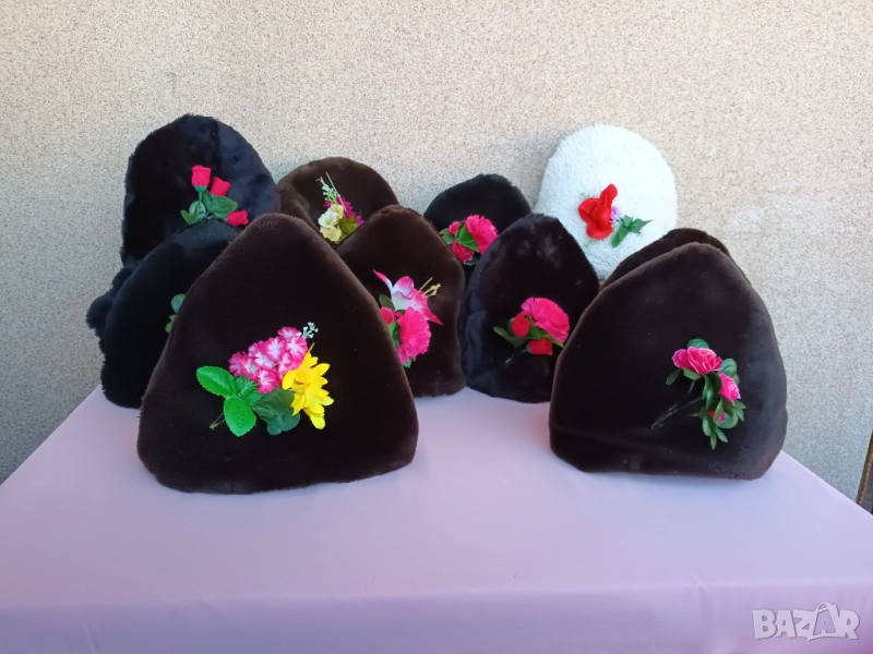 Черни, и тъмно кафяви калпаци изработени от еко кожа за детска национална носия с различна големина и цена по 35 лв. на брой, с обиколка на главата до 55 см.