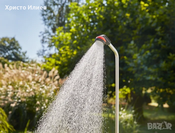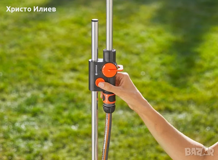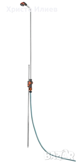 GARDENA solo осигурява освежаване в горещи дни. С помощта на клина, душът може лесно да бъде забит в тревната площ или в стойка за градински чадър. Напълно регулируемата височина посредством натискане на бутон дава възможност за настройване на душа към всякакъв ръст. Кран-регулаторът за регулиране на количеството осигурява желания воден дебит. Ще бъдете приятно освежени с меката струя от голямата душ глава.