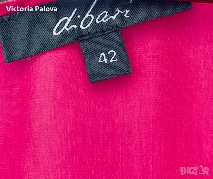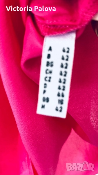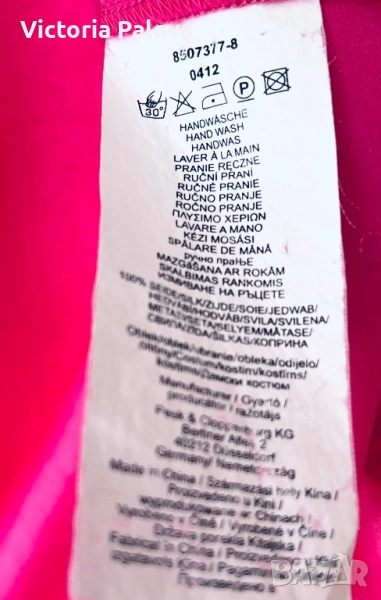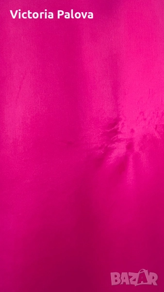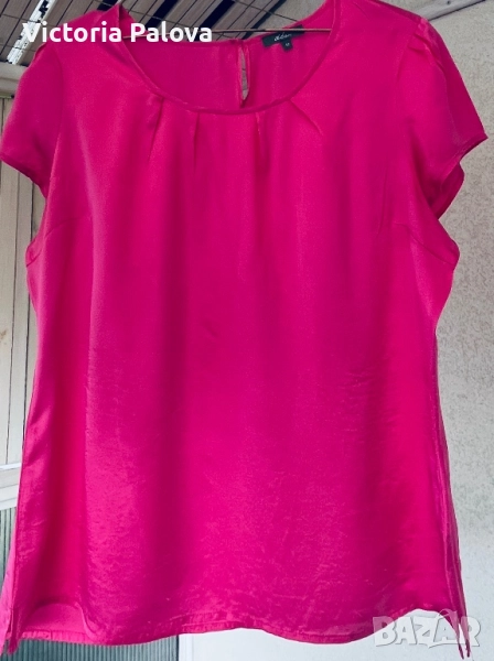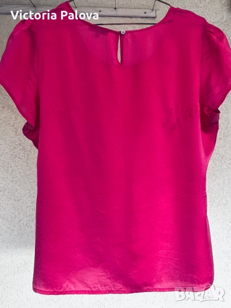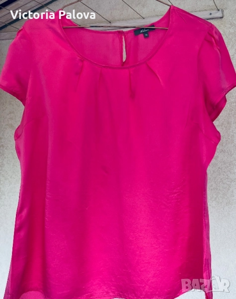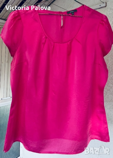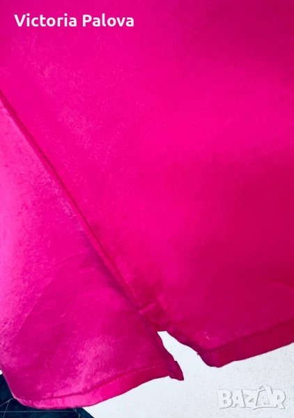 Летяща тънка коприна, малки странични цепки, ярък цвят. Рамо - 42см, ГО - 58см, дължина - 65см, широчината в долния край - 58см. Блузата има забележка - на гърба, показано е на снимка 8, цената е съобразена с това.
