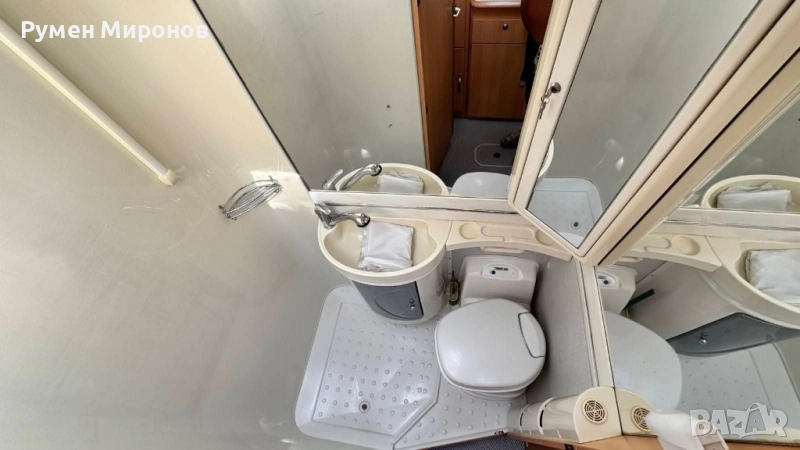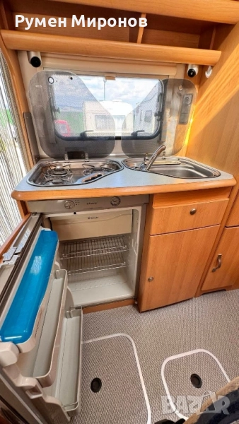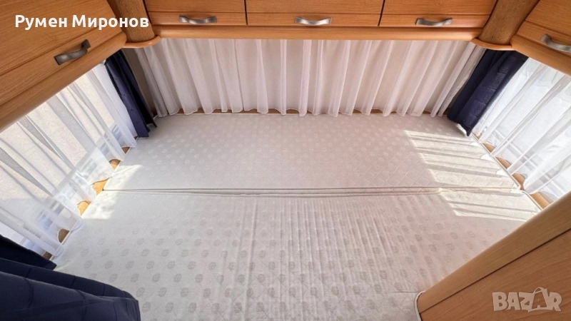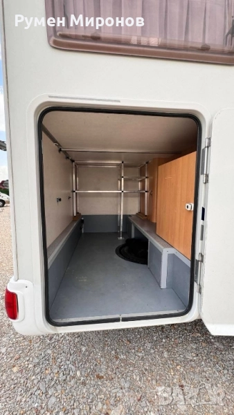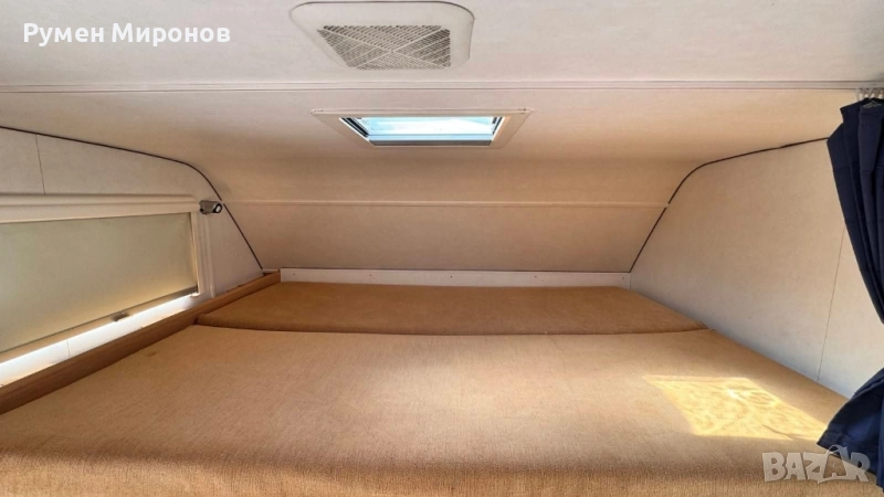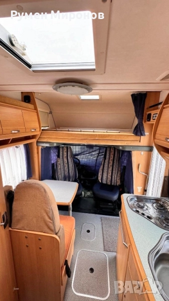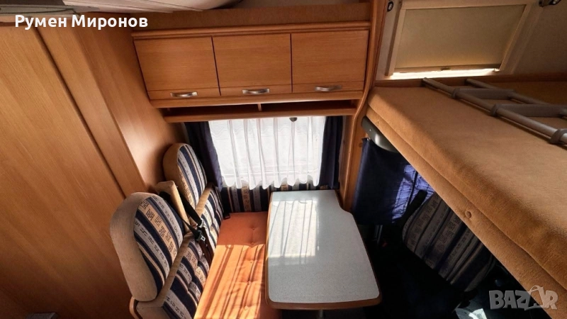 климатик към двигателя. Сменен комплект ангренаж, ролки, водна помпа и ремъци преди 35 000 километра. Без корозия по шаси. Теглича е вписан в талона. Добри гуми и акумулатор. Разположение: в алковена, спалня, която се повдига, за по-кофортно изправяне в кабината. Има стълба. Под нея седалките се въртят на 360°. Срещу вратата разтегателна маса и сепаре за двама човека, с място за багаж под него. В ляво от вратата кухненски бокс с течаща топла и студена вода, три газови котлона и хладилник с голяма камера. След него гардероб, под който се намира Комбито (осигурява топла вода и топъл въздух с обдухване на целият кемпер). Срещу него голяма баня с касетъчна тоалетна с обслужване от вън. В дъното спалня, под която се намира голям гараж (може да влезе скутер), с обслужване от вън. Там във шкаф се намират газовата бутилка и кабел за 220 волта, резервна гума и крик. Акумулатора за караванската част, съда за чиста и мръсна вода се намират в двойния под. От вън тента и осветление над вратата. Височина 3.10 метра. Ширина 2.55 метра. Дължина 5.80 метра. Годишна винетка. Цена 24 900 €. Намира се в София, район Божурище. 0878 266 554