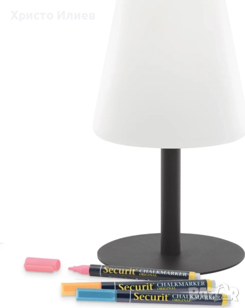 Пакетът включва и три тебеширови маркера Securit, които можете да използвате, за да рисувате и пишете индивидуално върху лампата. Дайте воля на креативността си и проектирайте лампата точно както искате – независимо дали като декоративен акцент или с персонализирани послания за специални поводи.