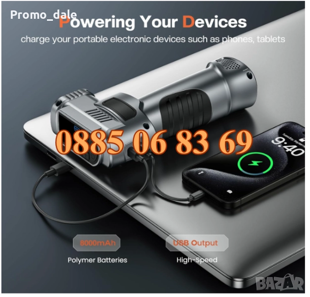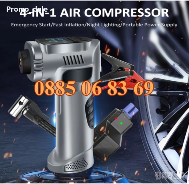 Преносимият компресор с Jump Starter 4в1 е многофункционално устройство, което комбинира автомобилен стартер, въздушен компресор, LED фенер и USB зарядно. Това го прави идеален спътник за всеки шофьор, особено при аварийни ситуации.