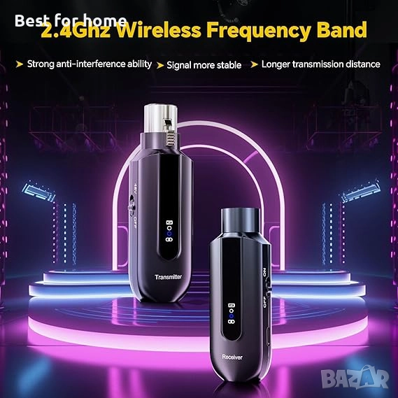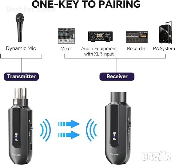XLR предавател и XLR приемник: Работи с всяка динамична, хармонична или кондензаторна микрофонна или безжична микрофонна система, аудио миксер и PA система, за да осигури стабилно и надеждно безжично предаване. Поддържа 6 комплекта на едно и също място едновременно. Идеален за партита, сватби, срещи, изпълнения на живо.