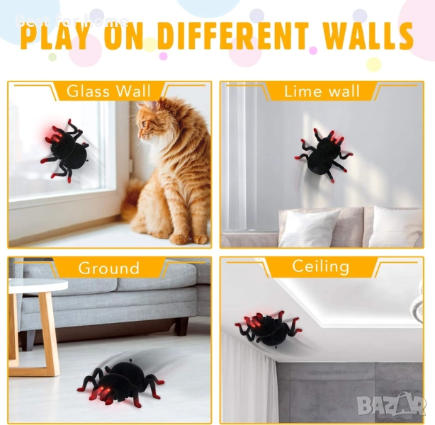 Двоен режим на шофиране по пода и по стената: дистанционно управляваният паяк има два различни режима на шофиране: режим на шофиране по земя или режим на катерене по стена. Ако настроите превключвателя в режим на стена, този акробатичен паяк може да се движи по стени, тавани, прозорци, подове, огледала, стъкла, шкафове и др. Ако настроите превключвателя в режим на земя, този дистанционно управляван паяк може бързо да се движи по земята.