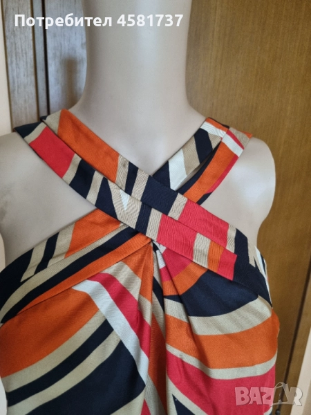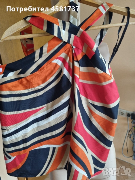 Красив копринен топ на бранда Nine West. С халтер деколте с двойни презрамки, странично закопчаване. Много наситена, въздействаща цветова гама. Коприната е лъскава, гладка и гали кожата. Прекрасен избор за елегантни дами. Със сако и делова пола и панталон би стоял невероятно. Успешно се комбинира с оранжев, коралов и цвят екрю. С класическо черно също, но черното би било доста скучно и няма да открои така прекрасните тонове.