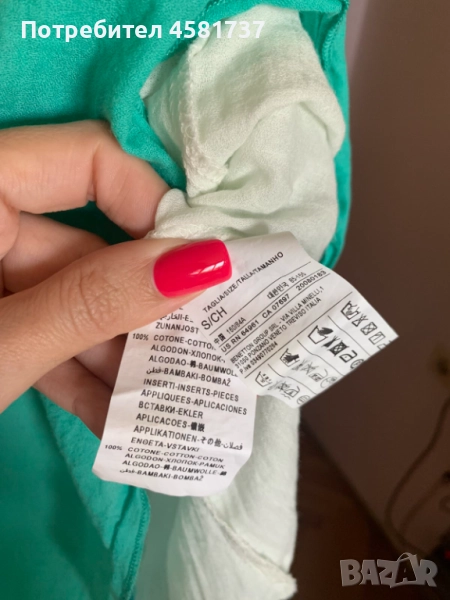 Състав:1оо % памук. По етикет е размер S, но предвид свободната кройка би стояла чудесно и на дами с размер М.