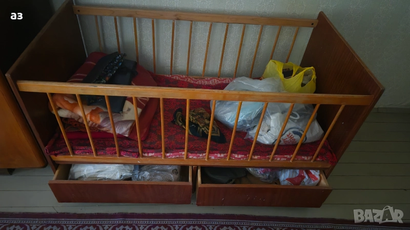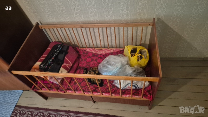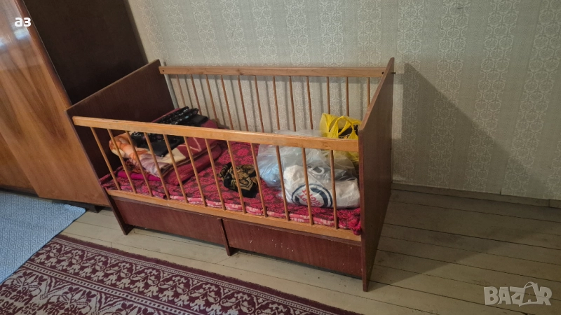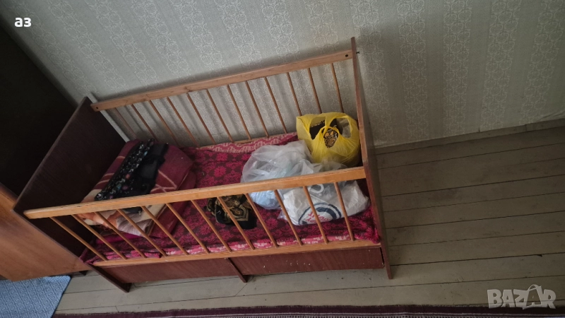 Детско дървено легло / кошара. Леглото е запазено без видими следи от употреба и има матрак, и две чекмеджета. Само лично вземане от град Исперих.