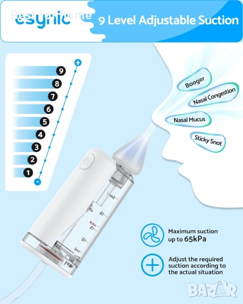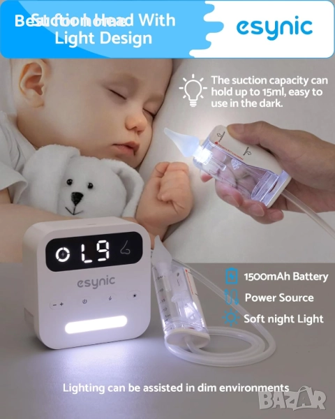 eSynic Професионален бебешки назален аспиратор, 9 нива на засмукване и LED светлина