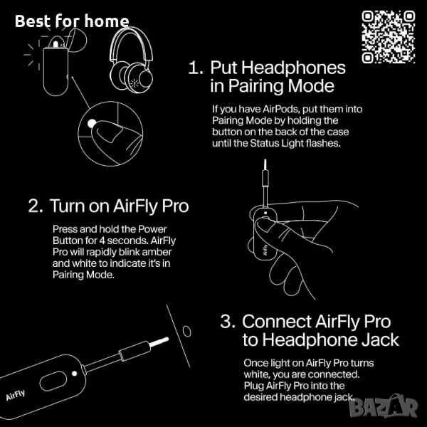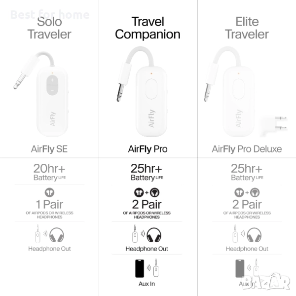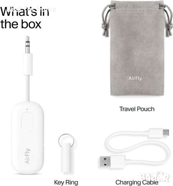 Безжична свобода - Предавайте безжично аудио от развлекателни системи по време на полет, фитнес оборудване, игрални устройства, телевизори или всеки 3,5 мм аудио жак, използвайки AirFly Pro. Наслаждавайте се на вашите AirPods, слушалки тип „тапи“ или безжични слушалки без досадните кабели.
