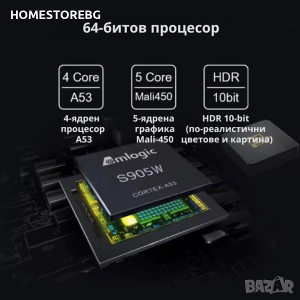 Процесор: Amlogic S905W, Quad-Core, ARM Cortex-A53, 64-bit
