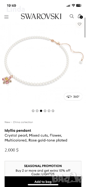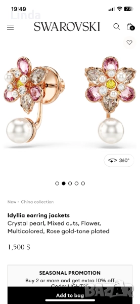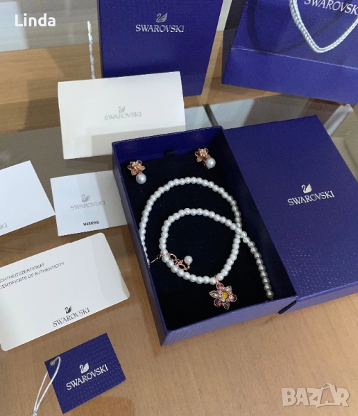 Комплект колие и обеци Swarovski, чисто нови са, обеците могат да се носят и само цветчетата, а може и както е показано с перличката да се вижда отдолу. Изключително красиви са и са подходящи и за подарък. С кутийки, сертификат, торбичка. Изпращам целия комплект както си е купен.
