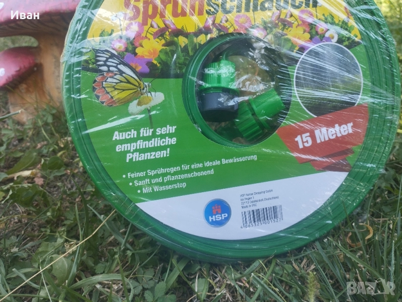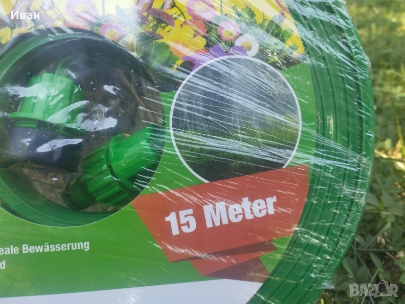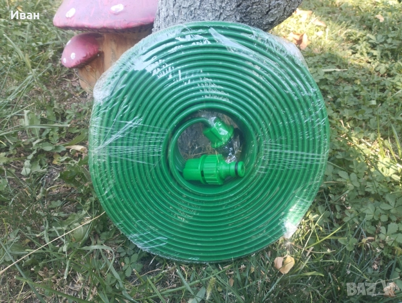 Маркуч с микро отвори за поливане на тревата, 15м, зелен, бърз конектор 1/2. Вътре има три по-малки тръби, през които тече водата. Има малки дупчици на равни интервали по цялата дължина на маркуча за оттичане на водата. Маркучът е с пластмасов накрайник, което прави свързването му към водоизточника бързо и удобно. Използване:- насочете дупките нагоре, за да го напръскате с вода под високо налягане, създавайки дъжд.- насочете дупките надолу, така че водата под високо налягане да капе в почвата точно до корените.