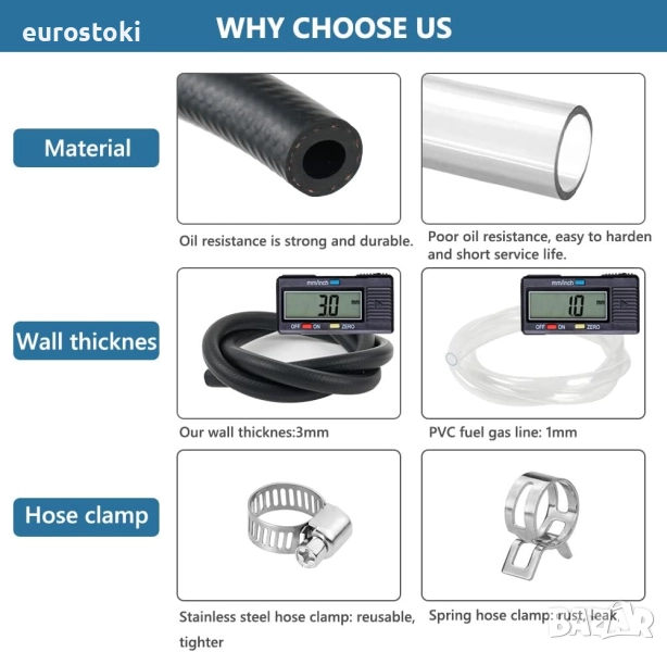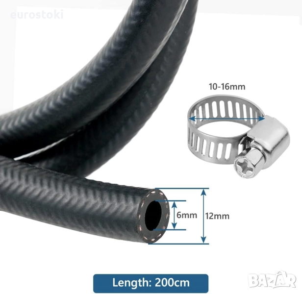 Ще получите горивна тръба с дължина 2 м, вътрешен диаметър 6 мм и външен диаметър приблизително 12 мм, 2 горивни филтъра с 10 скоби за маркучи от неръждаема стомана. Размерите на двете части са съвместими една с друга. Можете да ги използвате директно без допълнително закупуване.