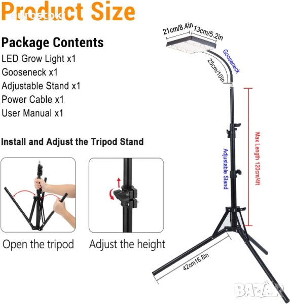 Вътрешната лампа за отглеждане на растения се предлага със здрав метален статив, който може да се постави на всяка маса или плот Тази фито лампа за отглеждане на растения е проектирана с гифкав прът, което ви позволява да регулирате лампата за отглеждане под всякакъв ъгъл и височина.