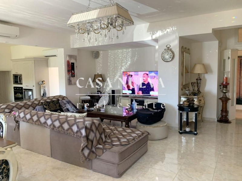 Интериорът е проектиран с внимание към детайла и е завършен с висококачествени материали каменни и дървени подови настилки, дизайнерско класическо обзавеждане и стилни акценти. Камината придава уют на дневната зона, а панорамните прозорци откриват гледки към морето и околния пейзаж.