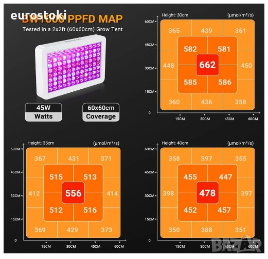 Основна площ на покритие/пълен спектър. Двойна ефективна площ на покритие от всички лампи от серията Reflector, идеална за разширяема площ от 45 x 45 см на височина 45 см. LED лампата за отглеждане на растения DragonLight осигурява пълноспектърно осветление от 395nm до 730nm (включително UV+IR) естествена светлина за растения на всички етапи от растежа, от зеленчуци до цветя.
