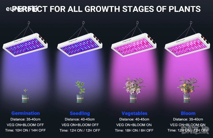 Превключвател за зеленчуци/цъфтеж. Висяща LED лампа за отглеждане на растения DragonLight BW1000 е снабдена с превключвател за зеленчуци/цъфтеж. Помага ви да пестите енергия и да подобрявате околната среда при отглеждане на растения. Той е проектиран да осигурява правилната светлина на растенията в различни етапи на растеж и значително да увеличи реколтата ви. Превключвателят за зеленчуци осигурява светлини от син и бял светодиод, които се използват само за растеж на семена или разсад. Превключвателят за цъфтеж осигурява светлини с червеният и белият светодиод. Както превключвателите за зеленчуци, така и за цъфтеж могат да се използват за цъфтеж.