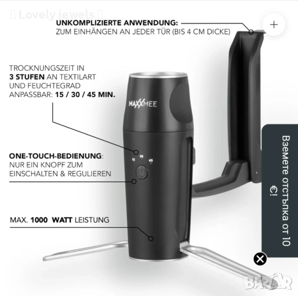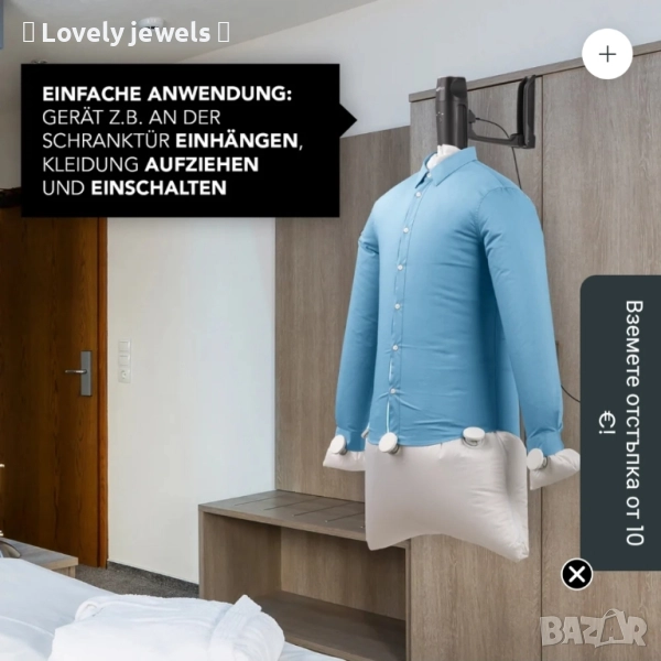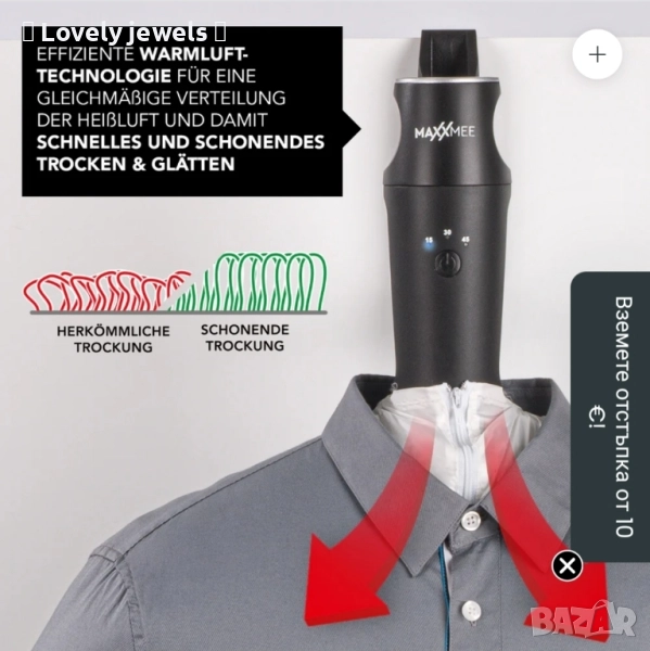 Независимо дали сте у дома или в движение, устройството за пестене на място просто се окачва на най-близката врата, ризата или блузата се издърпва върху балона, затяга се с щипките и сте готови! С едно натискане на бутон можете да регулирате таймера на три нива в зависимост от вида на плата и нивото на влажност. След 15 до 45 минути горнището ви ще бъде без намачквания и сухо. Идеално, ако искате бързо да върнете любимата си блуза във форма директно от пералнята.