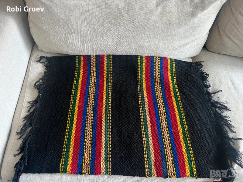 Красива ръчно изработена черга/килим в черен цвят с цветни вертикални ивици. Изработен е с техниката на тъкане и има ресни по краищата. Чергата е в отлично състояние, неизползвана и може да бъде декоративен аксесоар или за покриване на под.