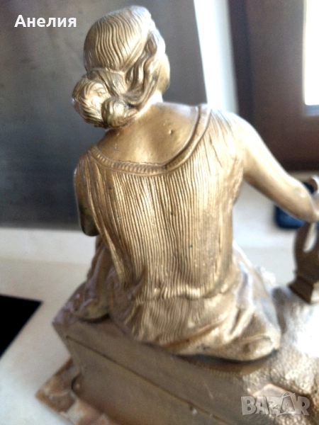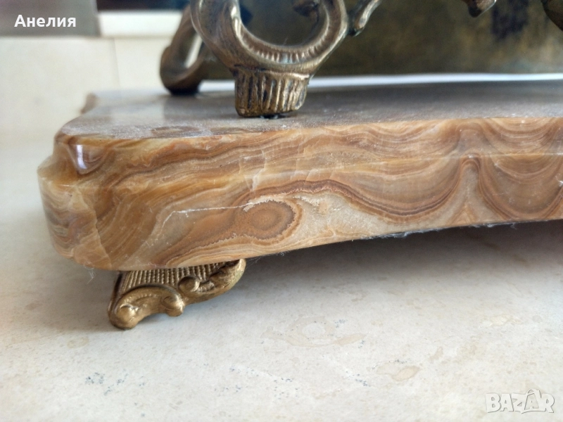 Античен настолен часовник, вероятно изработен от бронз или месинг, с фигура на жена отгоре и богато украсена основа, поставена върху мраморна плоча. Размери: дължина 51 см, височина 44 см.