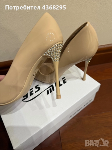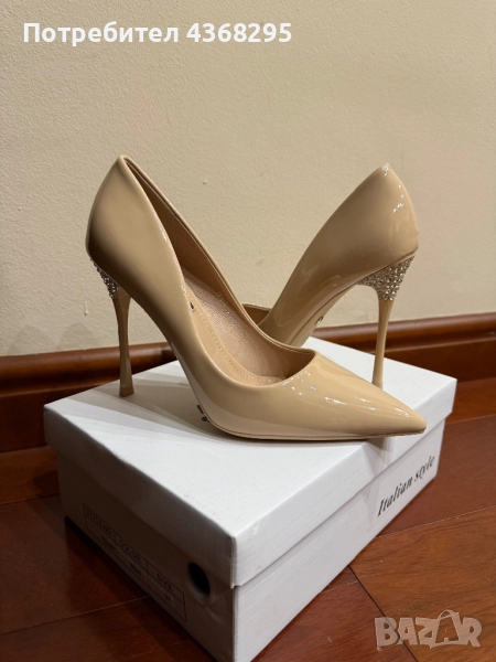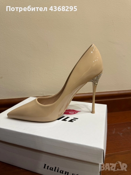 Дамски обувки на висок ток от Shoe Aquarium в красив бежов цвят - лак и декорация камъни на тока.
