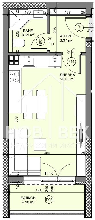 Имотът е южен, с чиста жилищна площ от 37.71 кв.м. и се състои от: коридор, дневна с кухня и трапезария, балкон, баня с тоалетна. Към всеки имот ще бъдат включени идеални части от общите части на сградата, както и от земята, върху която ще бъде изграден обект.